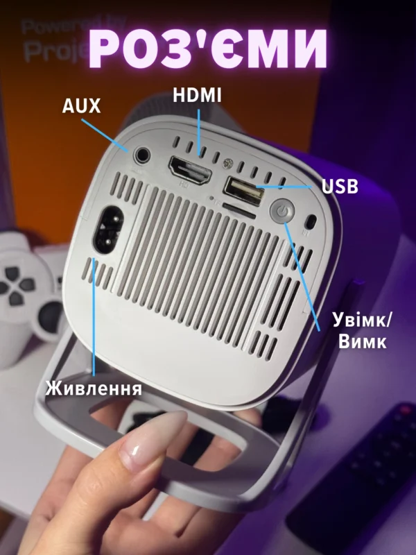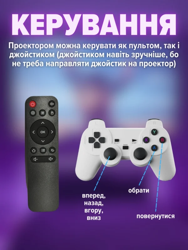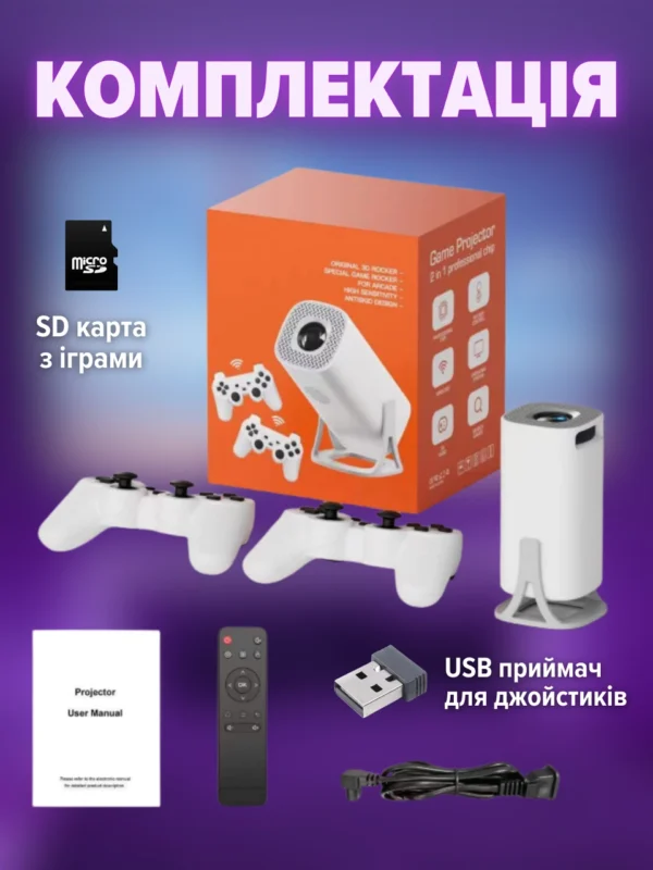 Проектор “projector + game” працює автономно без додаткових пристроїв. Він поєднує в собі домашній кінотеатр та ігрову приставку, яка містить понад 19 000 ретро ігор