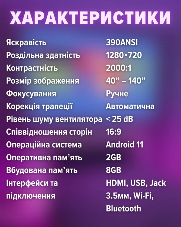 • Якісне зображення — HD (1280×720), яскравість 390 ANSI, контрастність 2000:1, діагональ до 120″.