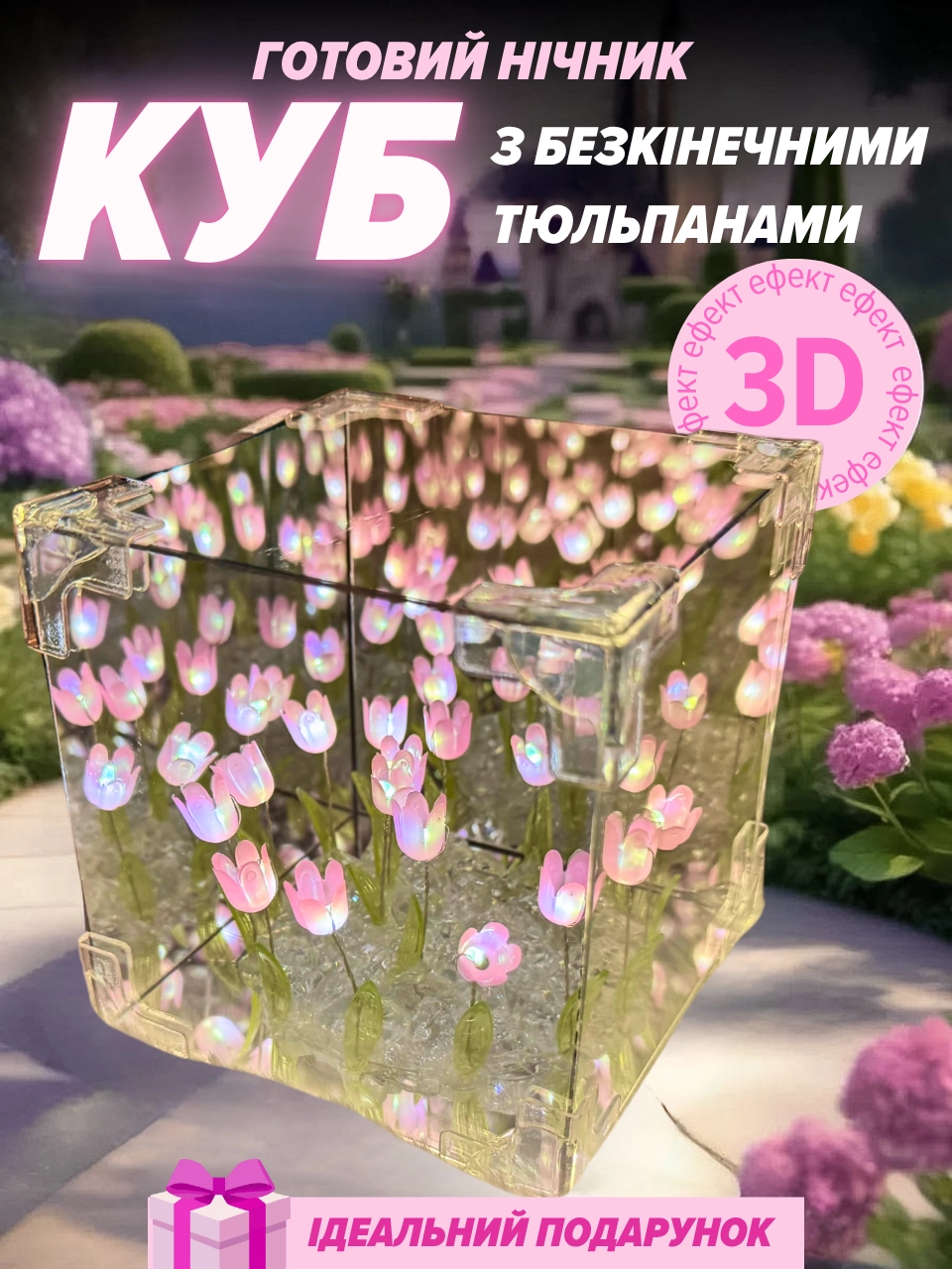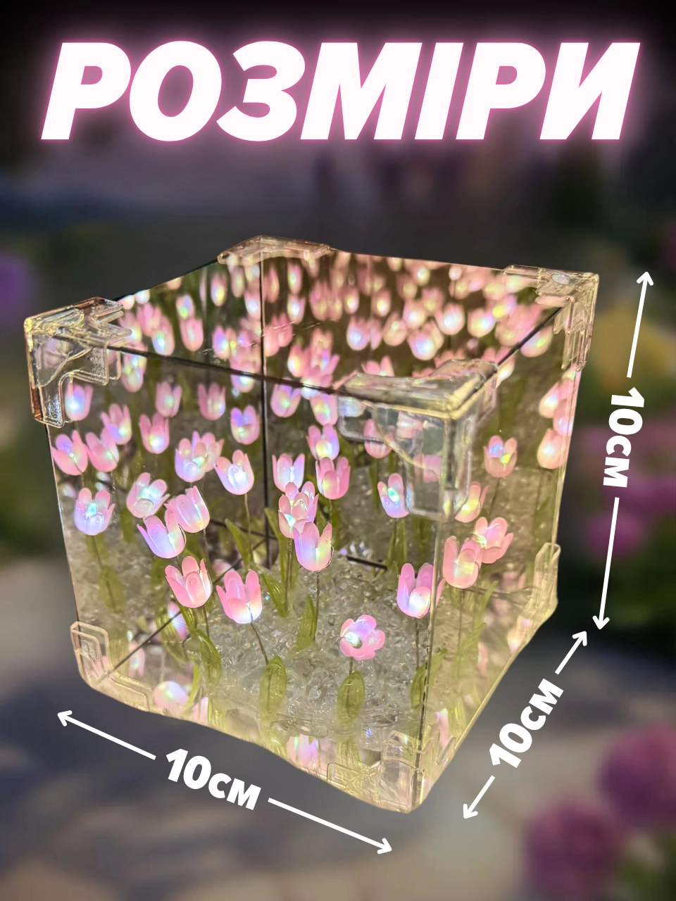 Відкрийте для себе унікальну композицію – куб із тюльпанами, що створює ілюзію безкінечного квіткового поля. Завдяки дзеркальним граням та вбудованій гірлянді він перетворюється на справжній світловий шедевр, який стане ідеальною окрасою будь-якої кімнати.