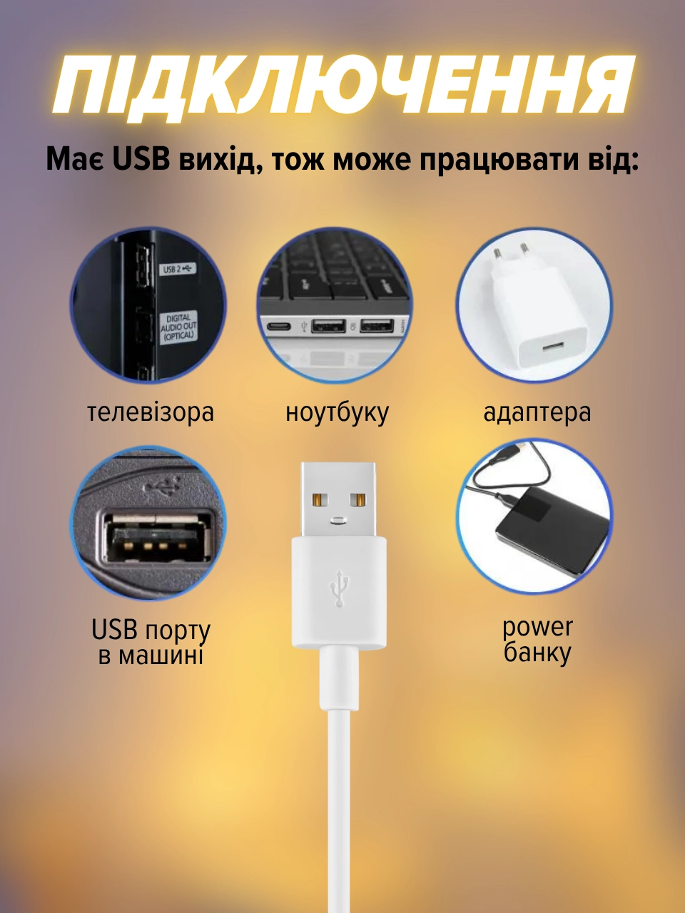 Живлення через USB — працює від розетки, павербанку, ноутбука тощо