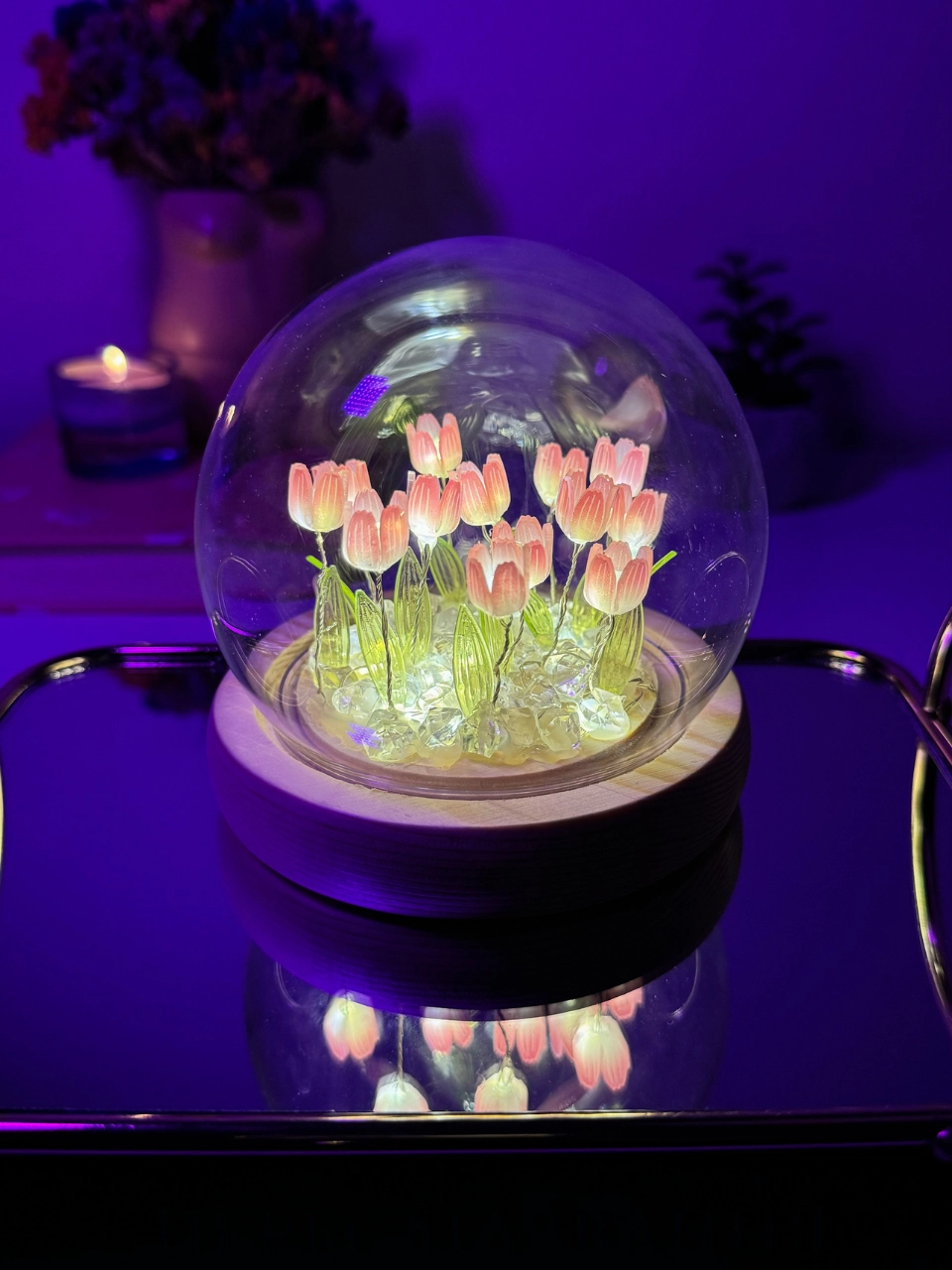 Рожеві тюльпани, що ніжно розпускаються під скляним куполом, створюють ефект казкового світіння. Міні сад із тюльпанами розташований на дерев’яній підставці.