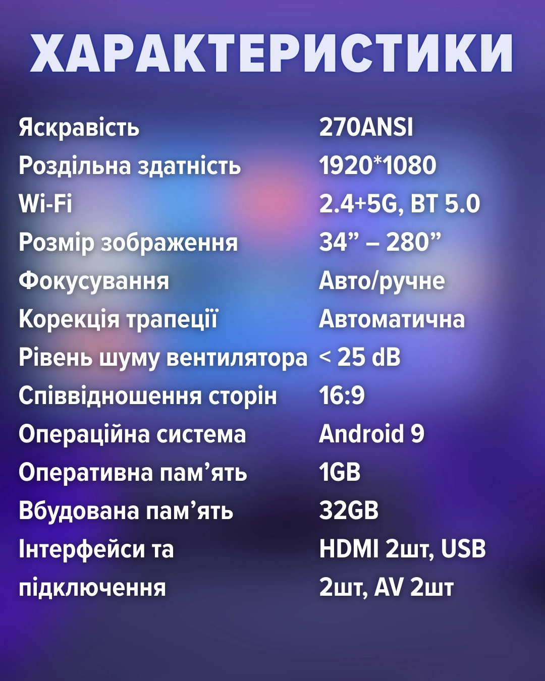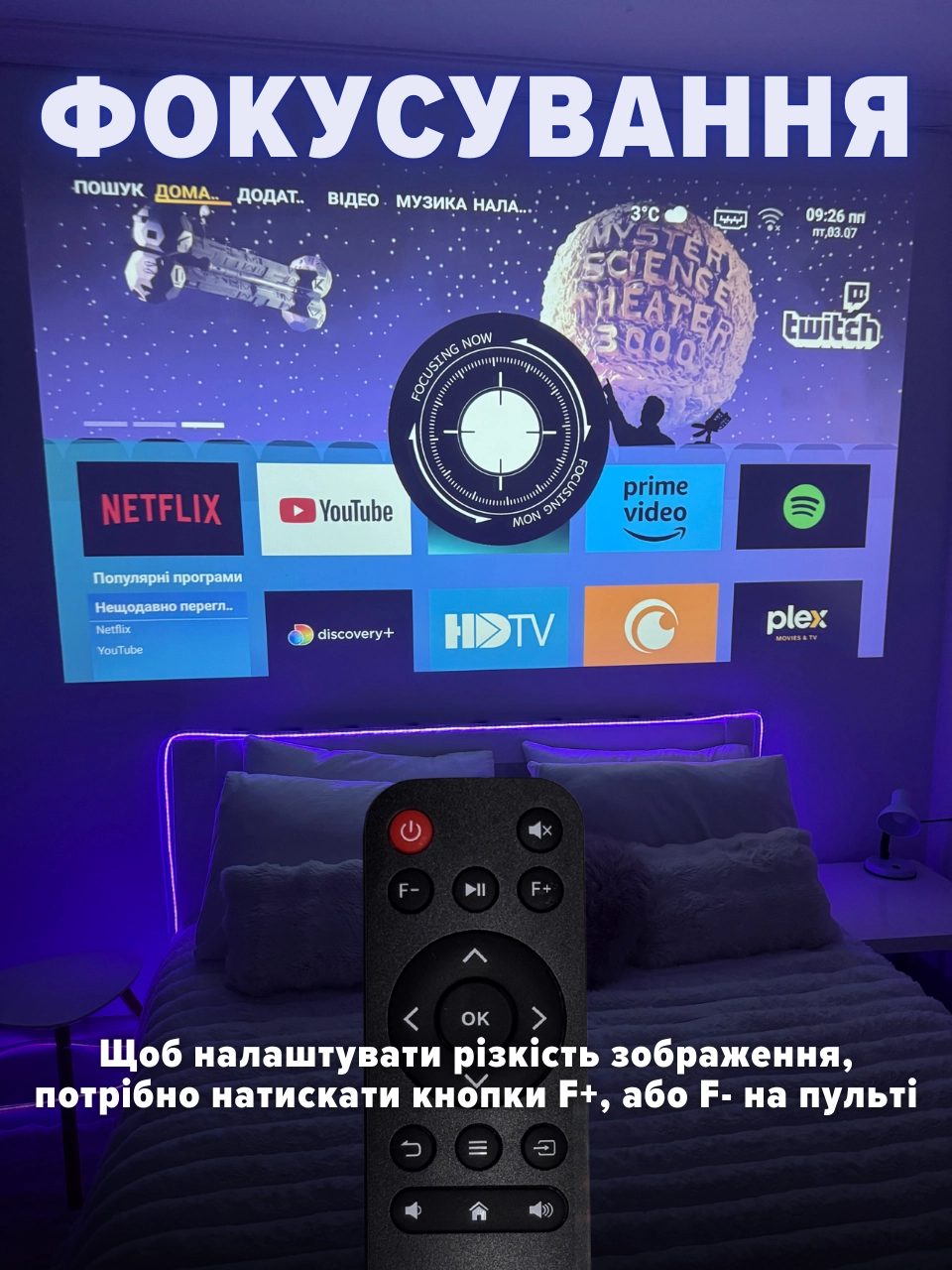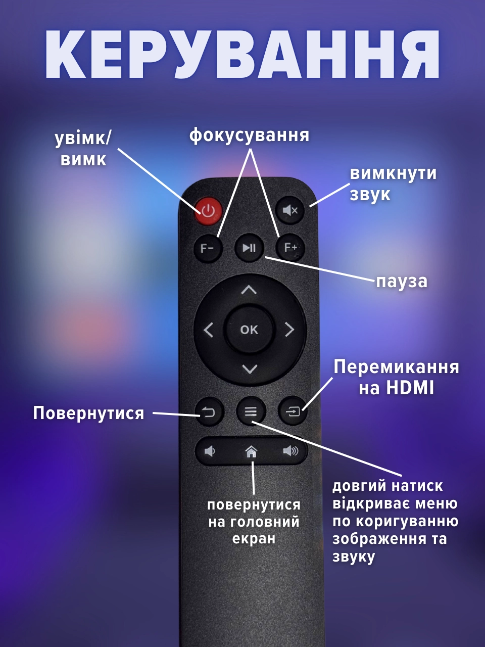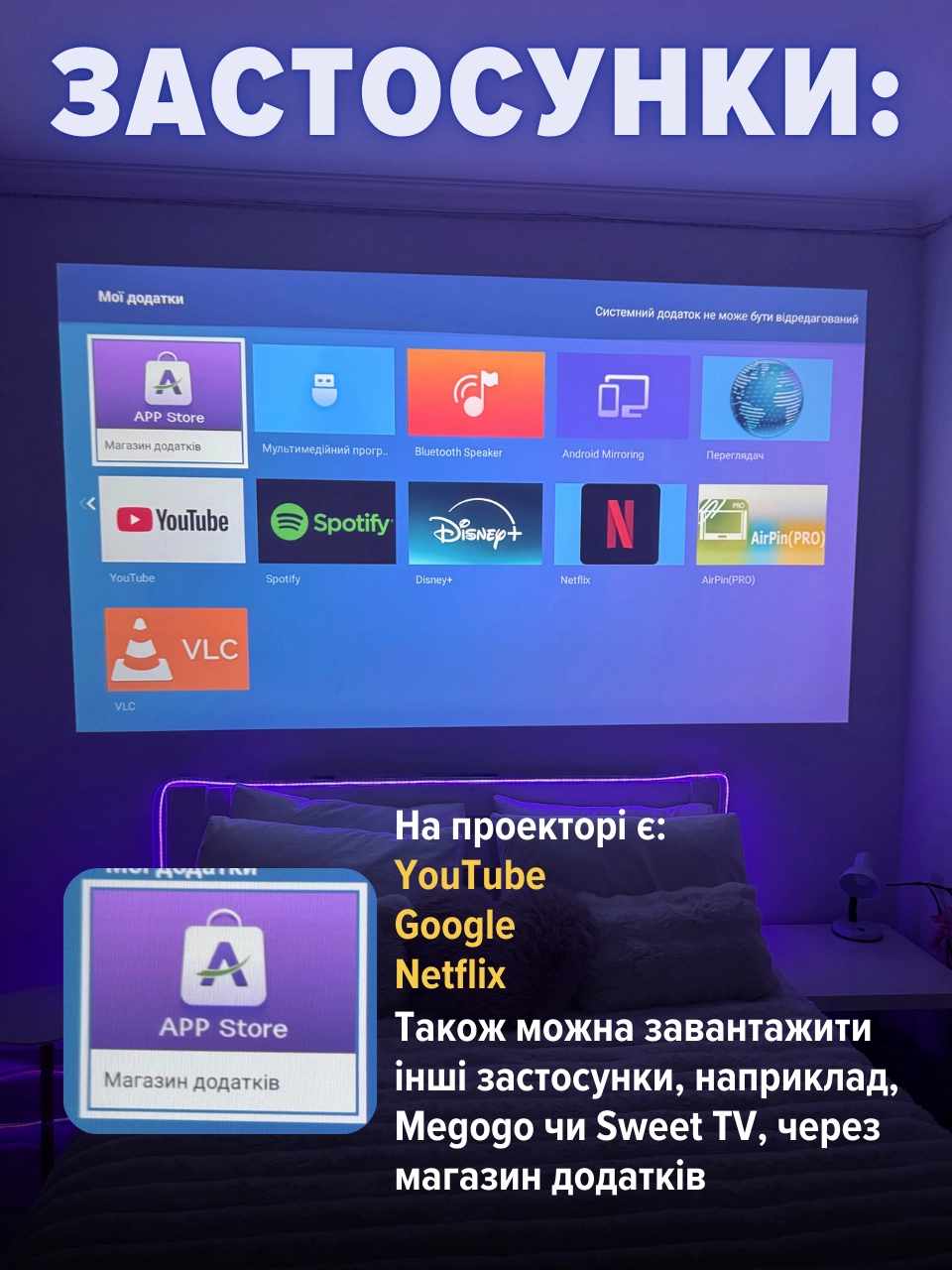 • Забезпечує доступ до програм та сервісів (YouTube, Netflix, онлайн-кінотеатри, навчальні платформи) прямо з проектора.