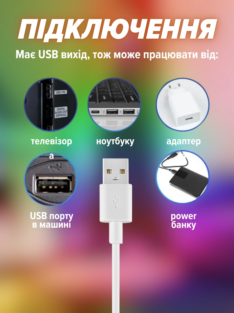 • Працює від USB — підключай до розетки, павербанку чи ноутбука