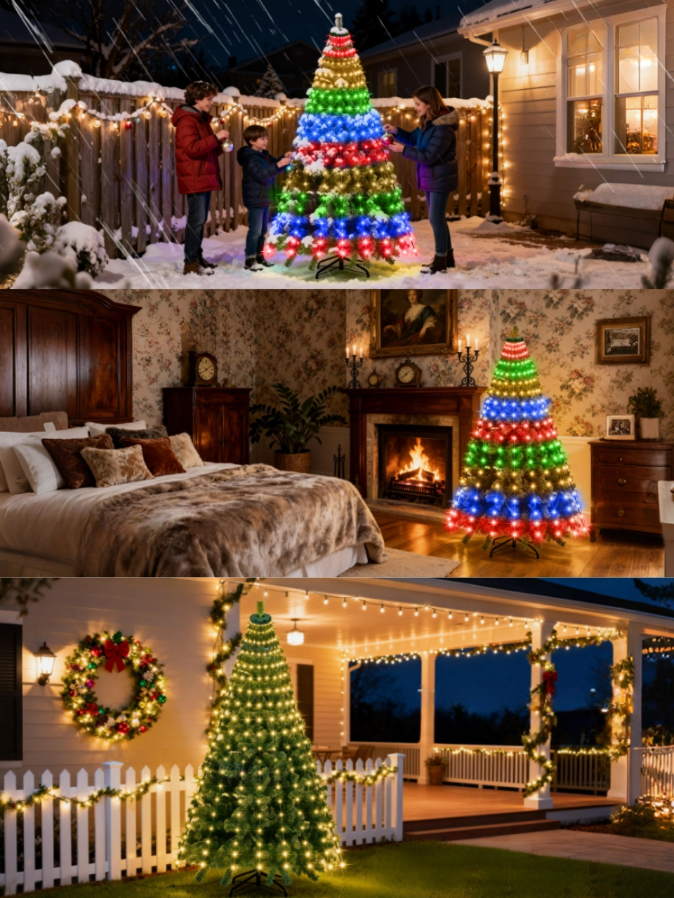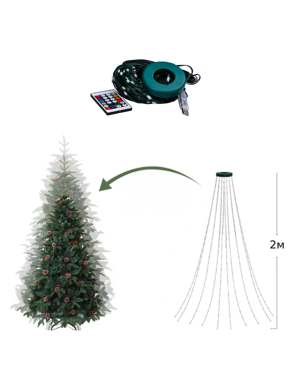 Встановлюється всього за 30 секунд! Просто «одягни» кільце на верхівку ялинки й розправ 10 світлових ліній — і ялинка готова сяяти ✨